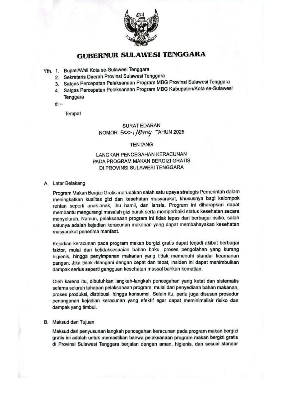 Langkah ini diwujudkan melalui penerbitan Surat Edaran Nomor 500.1/8704 Tahun 2025 tentang Langkah Pencegahan Keracunan Pada Program Makan Bergizi Gratis di Provinsi Sulawesi Tenggara.